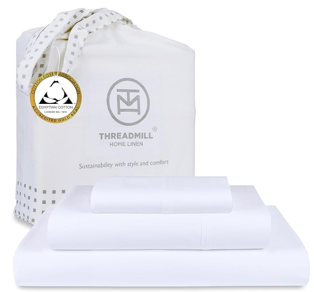 Threadmill Egyptian Cotton Twin XL Sheet Set | 100% Certified Egyptian Cotton Sheets for Twin XL Size Bed | Sateen Twin XL Bed Sheets Set Deep Pocket | Soft Hotel 3-Piece Cooling Sheet Set | White